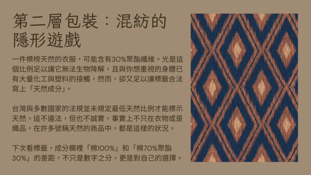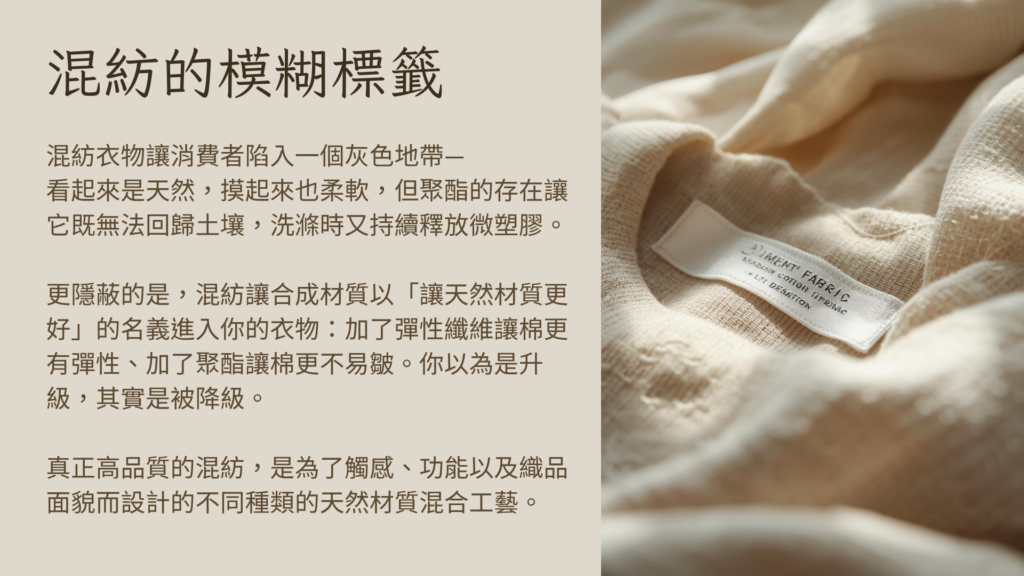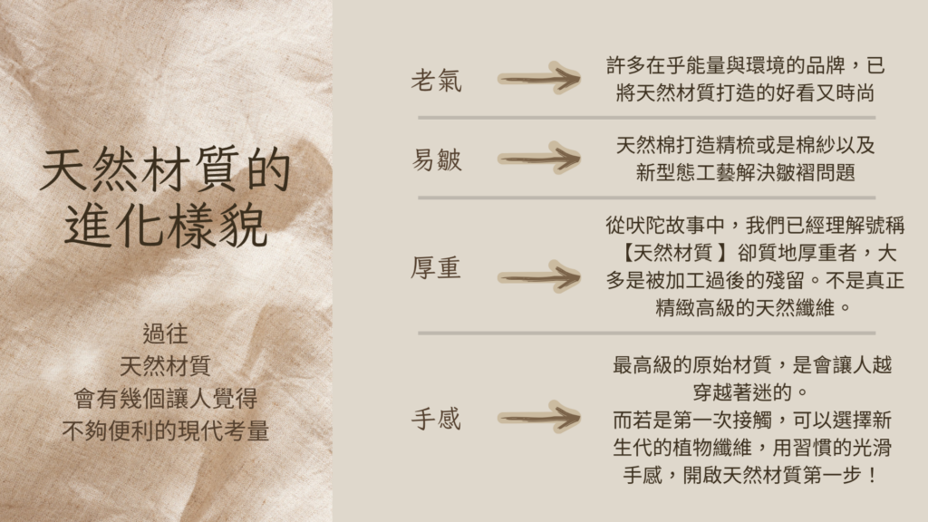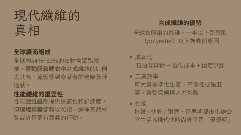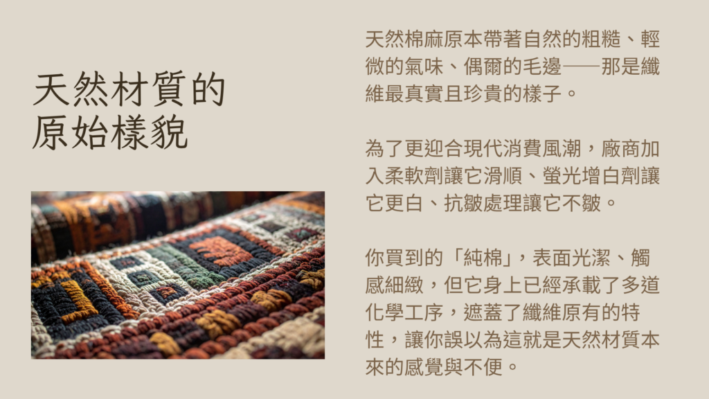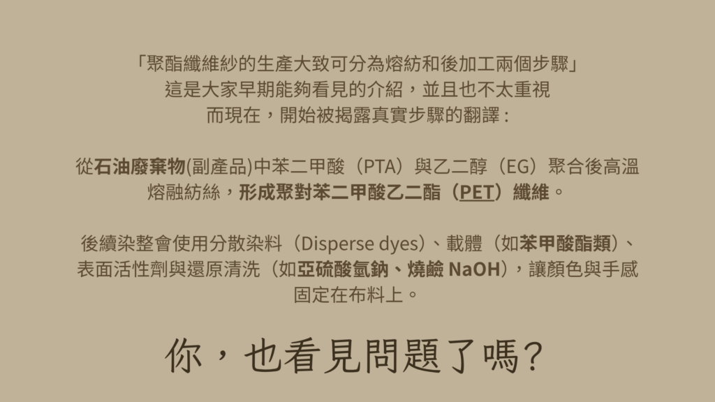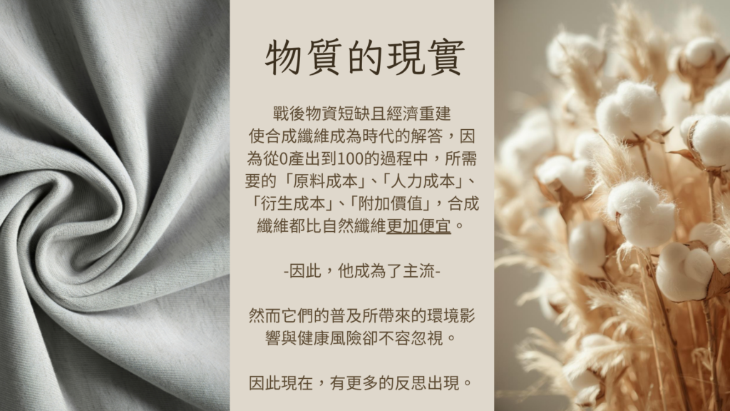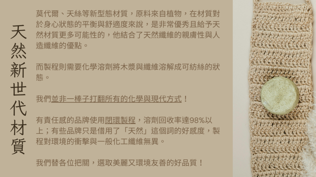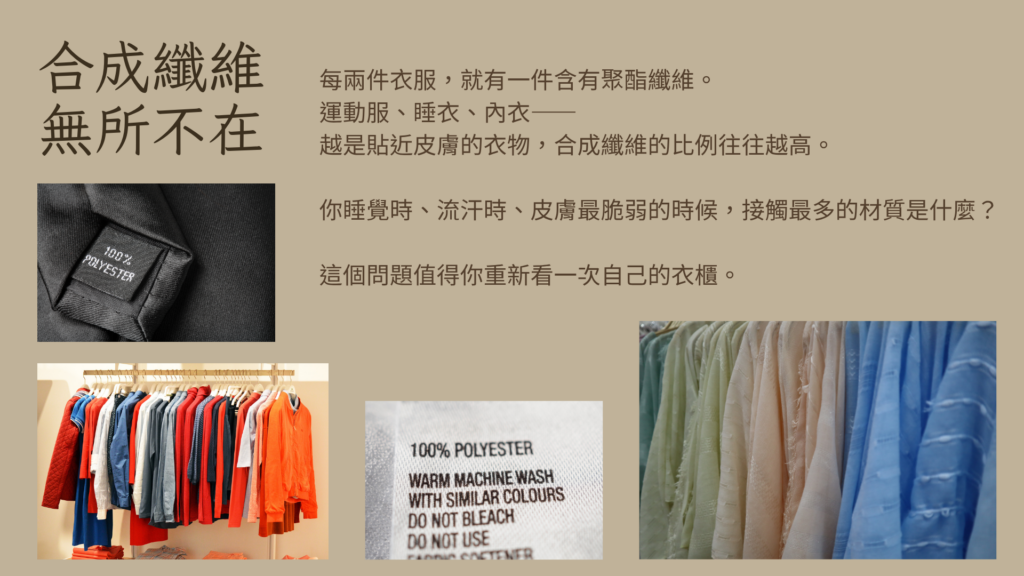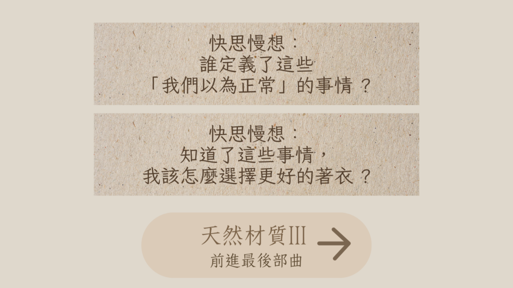 「正因為看清了這場由化工與經濟增長交織而成的『便利假象』,我們才選擇回歸天然纖維。這不只是對皮膚的溫柔、對身心的責任、對自己的品質生活保證,更是拒絕讓環境代價繼續在全球流浪的覺醒。」