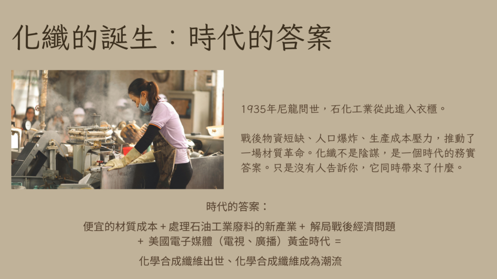 - 化纖的平庸化與代價: 當世界依循美國模式,透過台灣、中國到東南亞的加工接力,生產出大量廉價化纖時,我們雖然獲得了便利,卻失去了這種與自然律動同步的「穿著智慧」。污染被轉嫁到下游國家,而我們穿上的則是化工副產品。