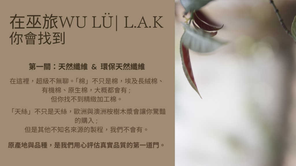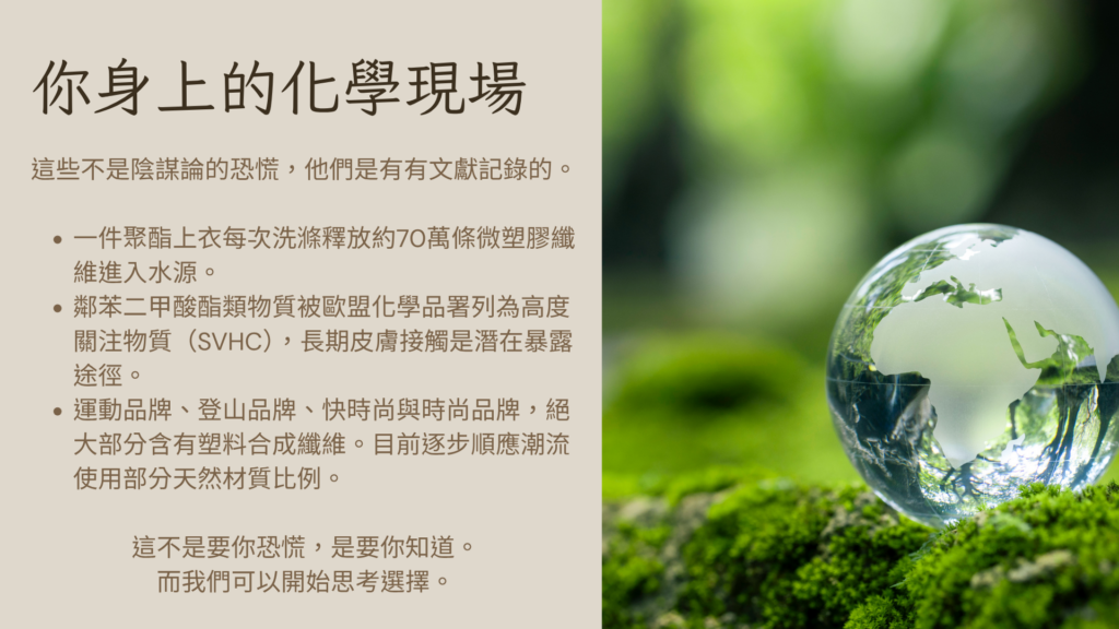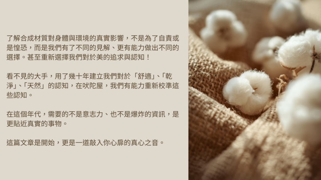 當代,為什麼有這麼多前所未有的疾病、情緒困擾、睡眠問題、高比例的癌症,在商業利益前面,我們很難聽到100%的實話,尤其是高度科技化與工業化的日常,壟斷了我們的食衣住行育樂,並且石油所產出的巨大石化工業涵蓋眾多商業版塊。但是,我們可以多替自己做一點點 - 把日常的衣著,開始進化。