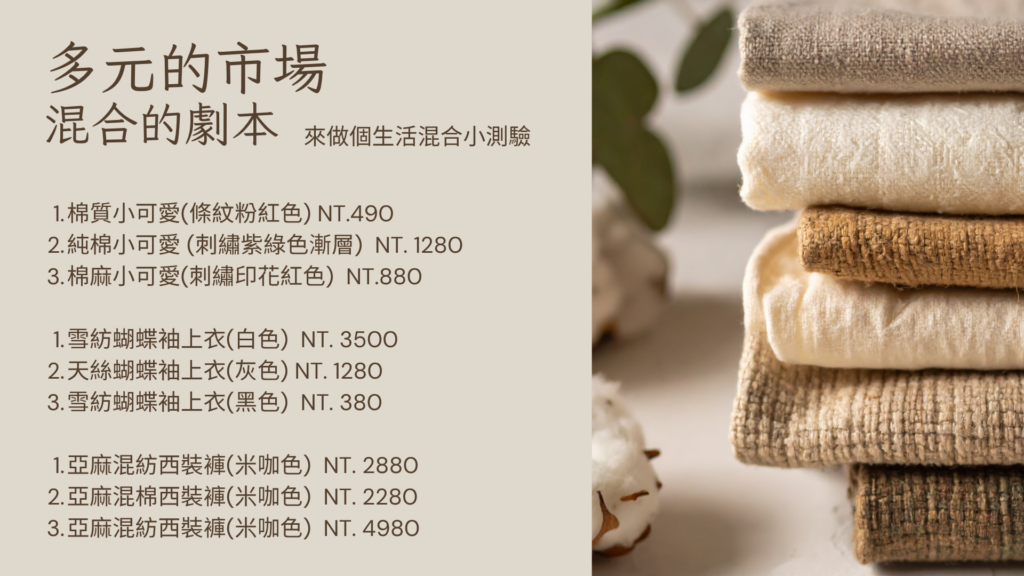 這些都是市面上販售的物件,要請你猜一猜,他們為【天然材質or合成纖維】與化纖混紡可能性,你一定會更加清楚日常的挑選。請使用小提示與每一項物件的價格,稍微來一探究竟市場的水深!