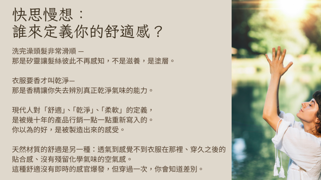 天然纖維的觸感讓身體不需要持續「處理」衣物帶來的感覺,而是安靜地存在。