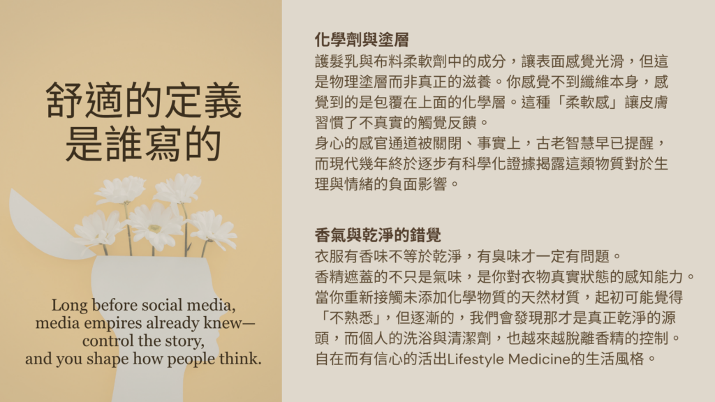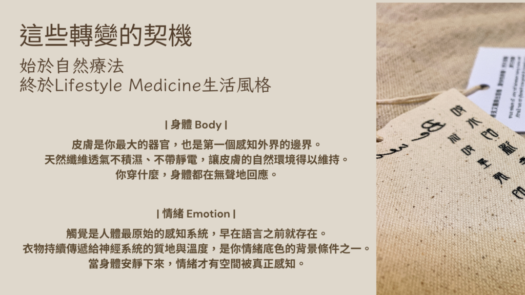從更貼近現代語境的角度來看:當身體不需要消耗資源去處理衣物帶來的化學刺激、靜電干擾、悶熱積濕,身體可以把這些資源用在其他地方——包括讓你感覺更清醒、更輕盈、更有活力。