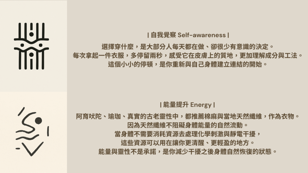在阿育吠陀、瑜珈傳統以及多個靈性實踐體系中,棉、麻、天然材質,一直是被推薦的衣物材質,原因不只是舒適,而是認為天然纖維不阻礙身體能量(Prana)的自然流動。而在現代能量學的語言中,就是直指天然纖維的頻率/震動較高。