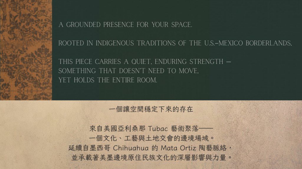 來自美國西南部最早的藝術聚落 ; 採取千年前工藝的復興創作,為馬塔奧爾蒂斯陶器的技法(國際的高階藝術品等級)